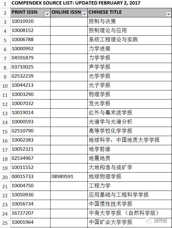 2017年Ei Compendex收录期刊目录(版本CPXSourceList_02022017),在2017年2月更新了。现在Ei期刊目录基本是一年一大更,几月一小更。Ei目录文件中明确定义:Ei Compendex收录出版物的目录是一直动态更新的,并且在有需要时公布更新。
