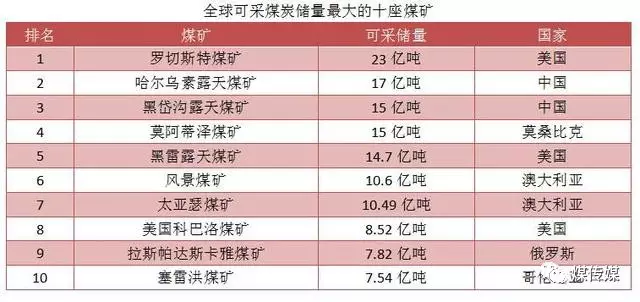 排名第一的是美国的罗切斯特煤矿,该矿可采煤炭超过23亿吨,该矿所在波德河煤田已成为当前全世界探明储量最大的煤田,美国40%的煤炭产自怀俄明州波德河煤田。每天,约21趟满载煤炭的列车都会从怀俄明州罗切斯特煤矿厂出发。罗切斯特煤矿厂上停着一辆可装载440多吨煤炭的货车。美国罗切斯特煤矿位于怀俄明州粉河盆地,是目前世界上可开采量最大的煤矿,属于露天矿,该矿可采煤炭超过23亿吨,由皮博迪能源公司所有。罗切斯特煤矿所产的煤被称为美国最清洁的煤,煤炭的平均热量为每磅8800英热单位,而硫分含量低于0.2%。